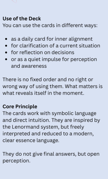 This deck is an intuitive guidance tool. It does not replace personal decisions, but supports awareness and inner orientation.